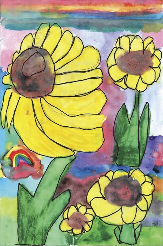 Against this energetic backdrop shines the students’ installation, Sunflowers. The sunflower has been one of our most recognizable state symbols since 1903, representing the beauty and resilience of Kansas. Every first grader at Shawnee Heights Elementary contributed a unique sunflower design, guided by teachers Tiffany Luttjohann, Ashley Tomes, and Lisa Taylor. Many artists leaned into brilliant colors, rainbow skies, bold textures, imaginative shapes, making the finished wall feel like a field of creative blooms bursting with life.